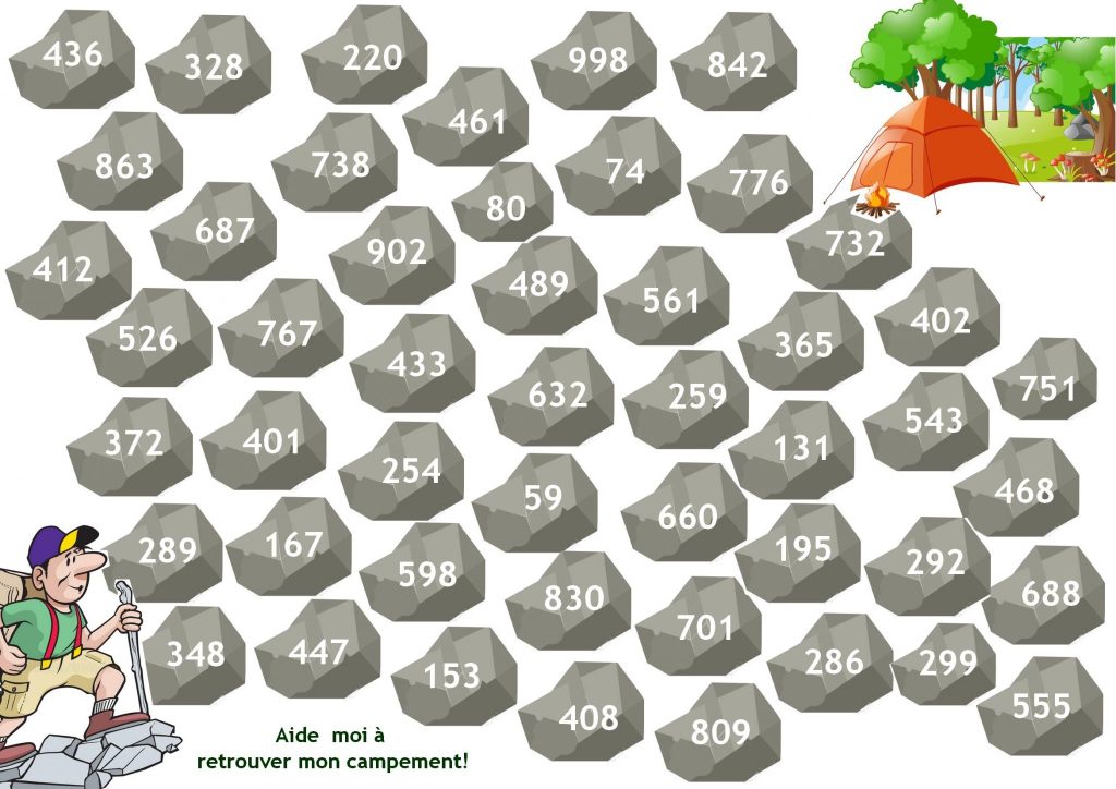 Aide le campeur à retrouver sa tente et trace son chemin grâce à une liste d’une dizaine d’opérations à poser (additions et soustractions mélangées).
