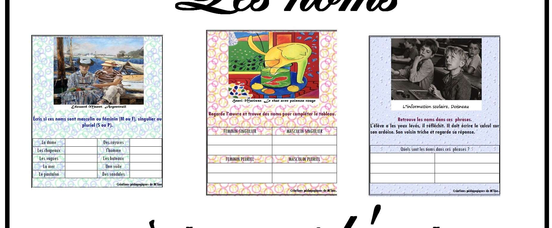 - Un tableau de genre et de nombre des noms à compléter grâce à des éléments observés dans les œuvres d’art.