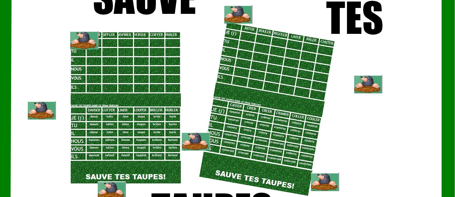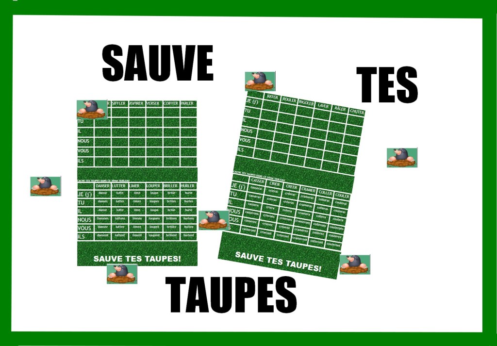 Chaque joueur cache ses taupes dans le terrain inférieur. Le but est de retrouver où sont cachées les taupes de son adversaire. Pour cela il va le questionner par rapport au tableau supérieur. « As tu caché une taupe dans la case « nous » avec le verbe « trouver »? Et il va écrire la conjugaison du verbe sur son ardoise.