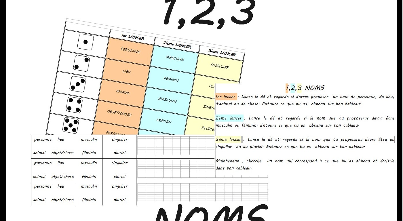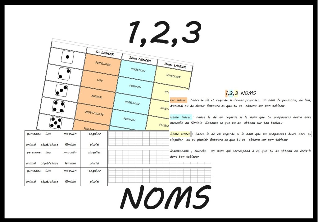 Les élèves doivent lancer 3 fois le dé pour savoir s’ils vont devoir trouver un nom de lieu, d’animal, d’objet ou de personne/ masculin ou féminin/ singulier ou pluriel.