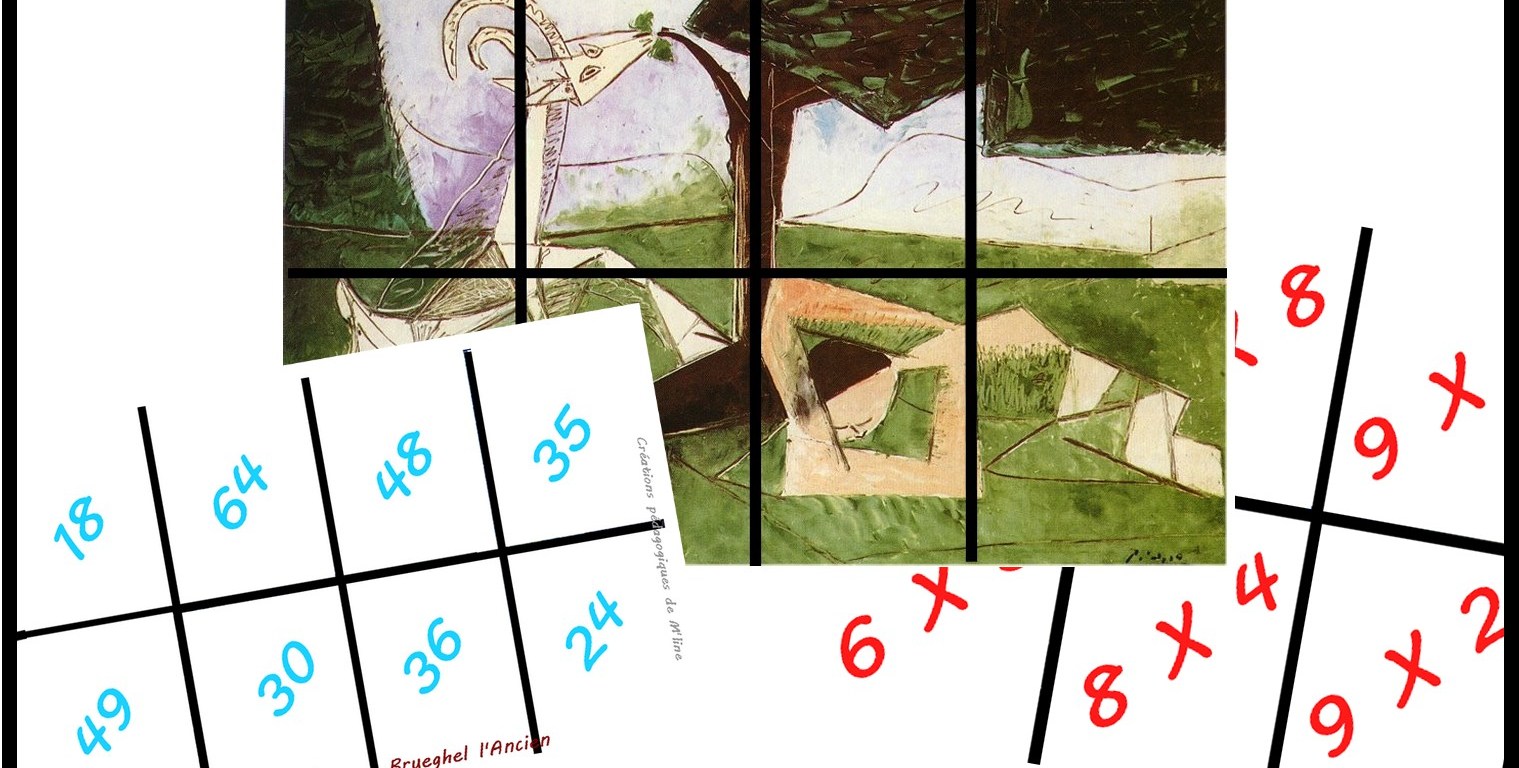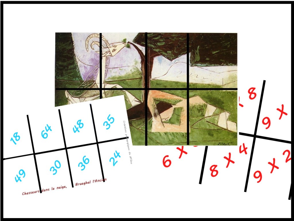 Les résultats des opérations servent de planches de loto sur lesquelles les élèves vont venir poser les morceaux d’œuvre pour reconstituer leur œuvre d’art. Un élève annonce un calcul (exemple 3×8), celui qui a le résultat 24 sur sa planche prend le morceau et le pose. Le premier qui a reconstitué son œuvre a gagné.